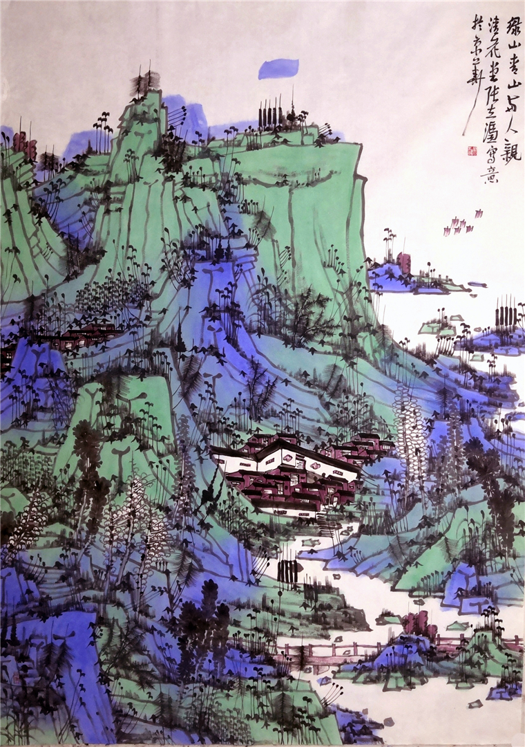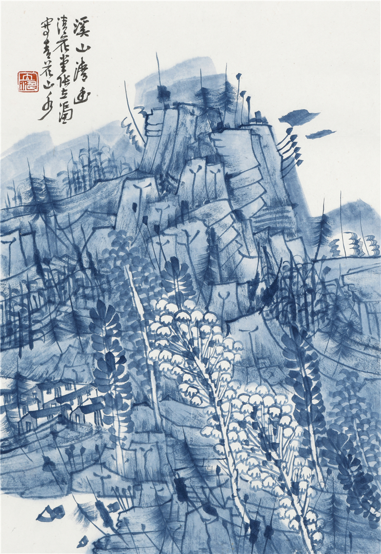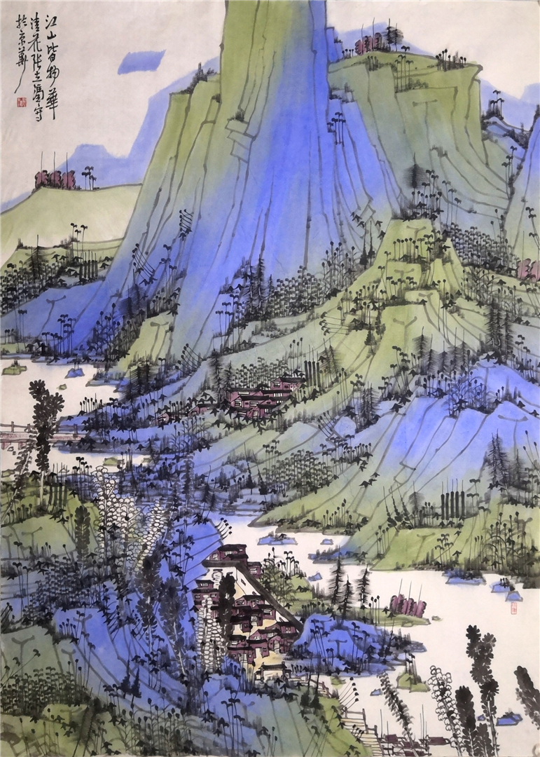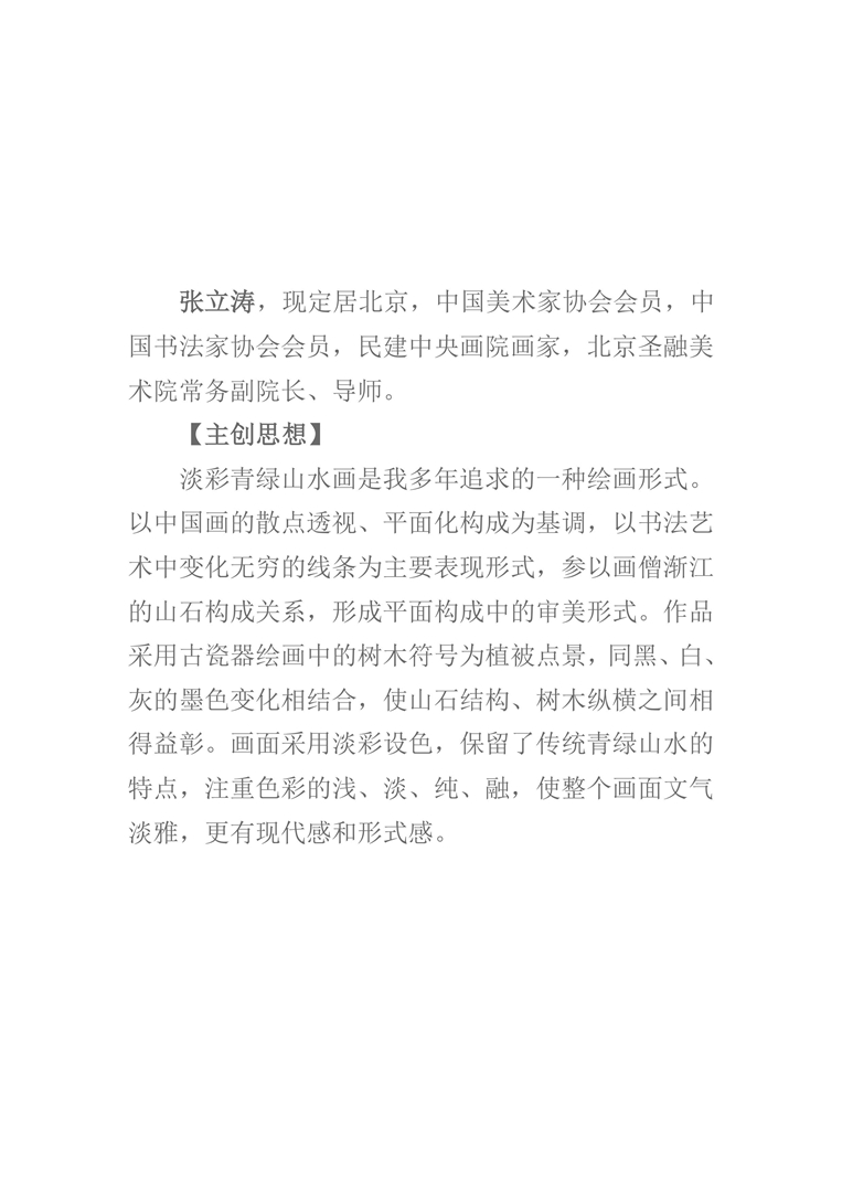 淡彩青绿山水画是我多年追求的一种绘画形式。以中国画的散点透视、平面化构成为基调,以书法艺术中变化无穷的线条为主要表现形式,参以画僧渐江的山石构成关系,形成平面构成中的审美形式。作品采用古瓷器绘画中的树木符号为植被点景,同黑、白、灰的墨色变化相结合,使山石结构、树木纵横之间相得益彰。画面采用淡彩设色,保留了传统青绿山水的特点,注重色彩的浅、淡、纯、融,使整个画面文气淡雅,更有现代感和形式感。
