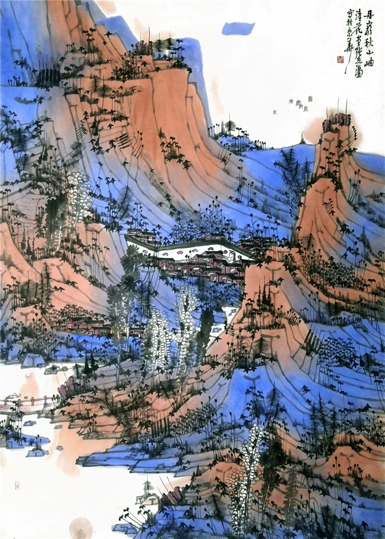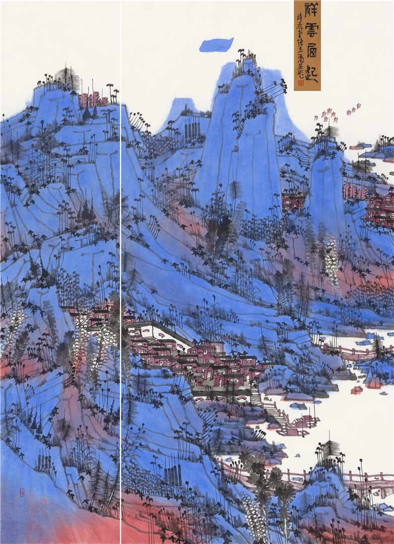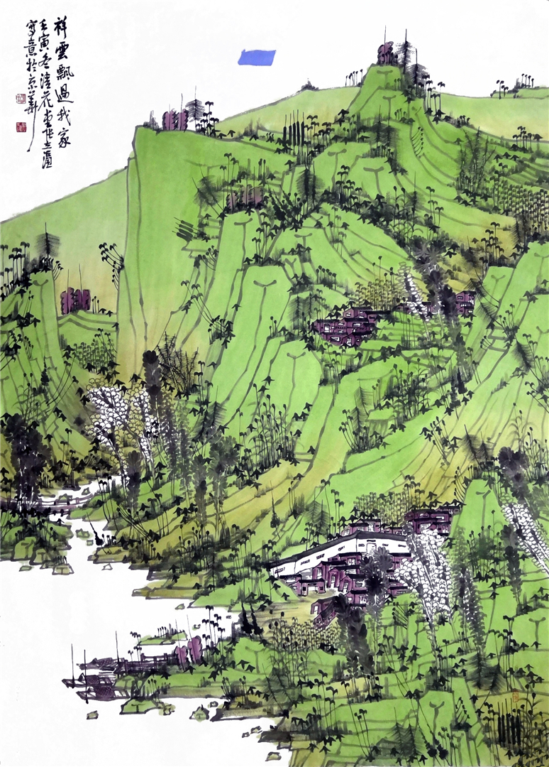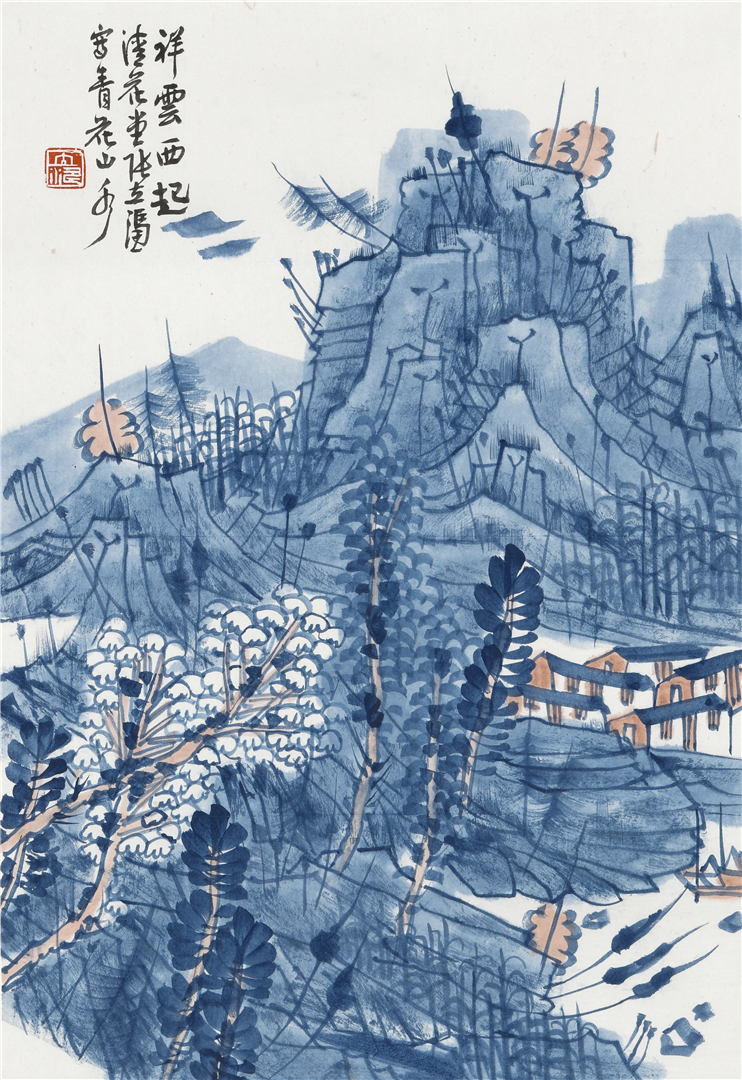 淡彩青绿山水画是我多年追求的一种绘画形式。以中国画的散点透视、平面化构成为基调,以书法艺术中变化无穷的线条为主要表现形式,参以画僧渐江的山石构成关系,形成平面构成中的审美形式。作品采用古瓷器绘画中的树木符号为植被点景,同黑、白、灰的墨色变化相结合,使山石结构、树木纵横之间相得益彰。画面采用淡彩设色,保留了传统青绿山水的特点,注重色彩的浅、淡、纯、融,使整个画面文气淡雅,更有现代感和形式感。